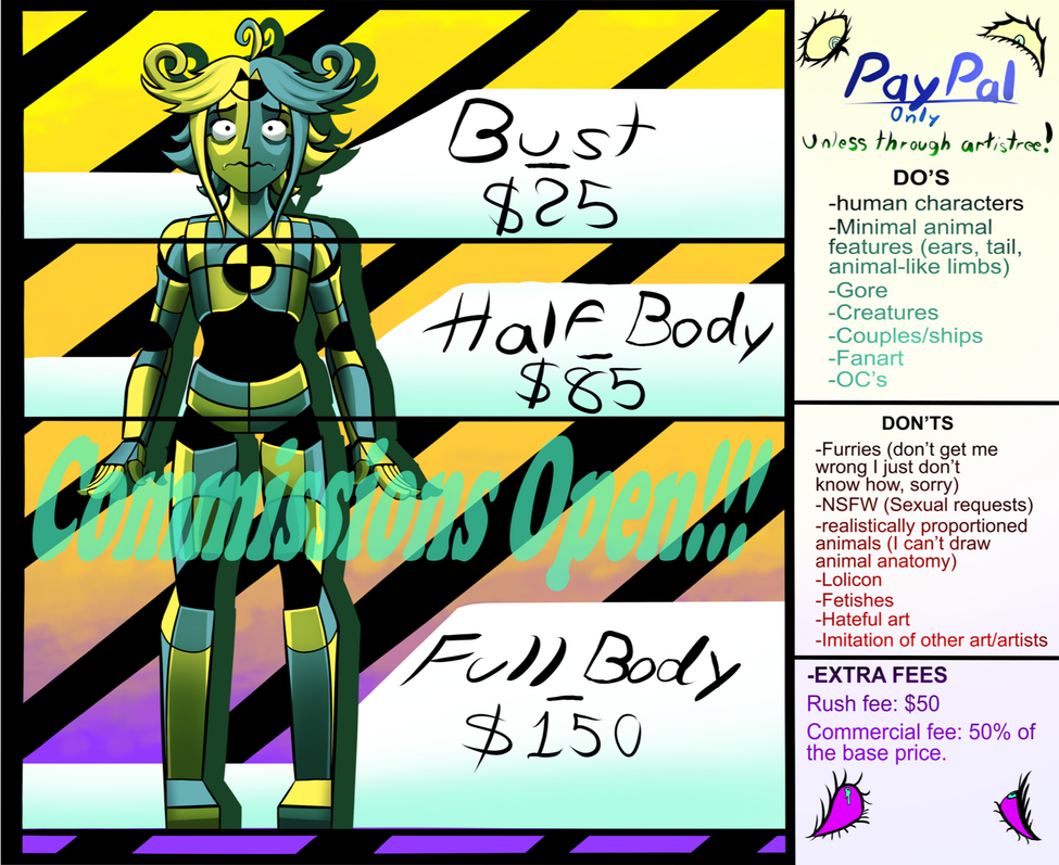 I accept payment mainly through PayPal. If you don’t have access to PayPal, I take commissions on artistree. I don’t accept payment through bank transactions, checks or any other form of payment, if unable to accommodate the commission will be denied.